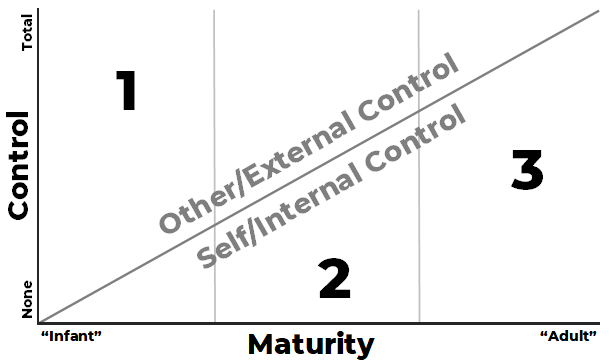 In the chart above, you can see that Maturity runs left to run from "infant" to "adult." While adults can act like children and children can behave well beyond their years, we expect more mature behavior from people when they're older and look or act more capably in general. Unfortunately, age and maturity aren't reliably related and all of us can act more like difficult or grumpy kids at times. Far too many adults even have temper tantrums. So, while we tend to think about maturity as an age-related thing, it's better to see it in stages. These are labeled 1, 2 and 3 in the body of the chart. We'll talk about these in detail below.