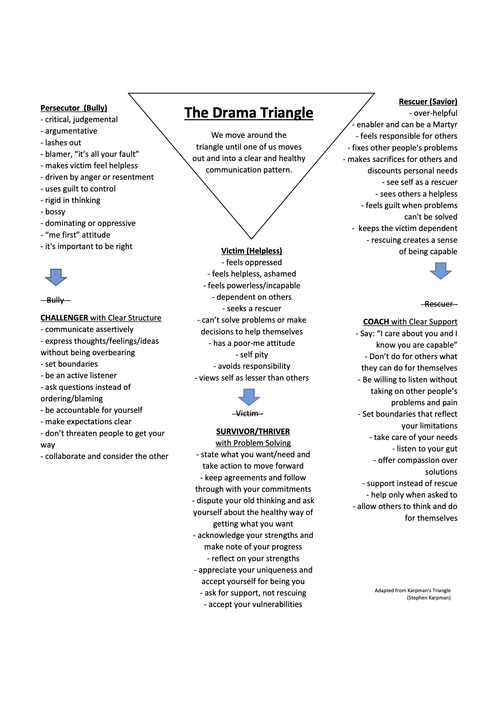 When you get into an argument or some other form of drama, you fall into one of three roles. While the drama is going on, you switch roles from time to time. You usually have your preferred roles but depending on the moment you may shift to another role as the drama evolves. The roles are described below. (An annotated "infographic" chart of the triangle can be found at the back of this handout.)