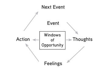 The Think-Feel-Do cycle starting event often "triggers" or "cues" memories and launches a memory-based habit of thoughts and feelings. Strong feelings can encourage you to impulsively react before you're aware of your thoughts or the need to make choices. This is almost always a bad place to be in difficult relationships. Even if you don't act impulsively, negative thoughts and feelings tend toward negative actions. You have two windows of opportunity to change this. First, you can pay attention to your thinking and take steps to deal with the cognitive distortions that are present. Taking charge of your thoughts lets your feelings downshift to a healthier level.