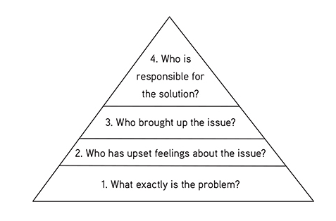 The final question to ask is: "Who's responsible for the solution?" This completely depends on how you answered the last two questions. If there's just one name for both that's easy. It's that person. If that's not you, don't try to fix it. If there's more than one person, a shared solution or several partial or individual solutions may be needed. Only take care of your part. If the upset person isn't the one who brought it up, it's most likely the one who's bringing it up needs to deal with it. Whoever is responsible is the "Top of the Pyramid."